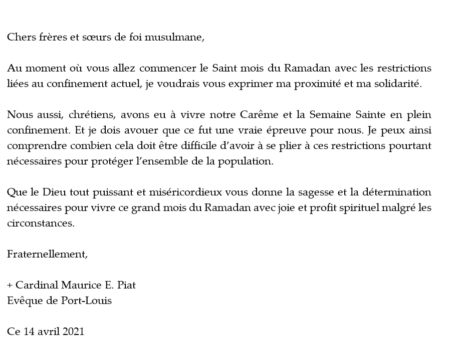 Cette année, comme en 2020 , les Mauriciens de foi musulmane observeront le jeûne du Ramadan en confinement. Dans son message aux Mauriciens de foi musulmane, le cardinal Piat exprime sa solidarité et son soutien et rappelle que les restrictions ont pour but de protéger la population.