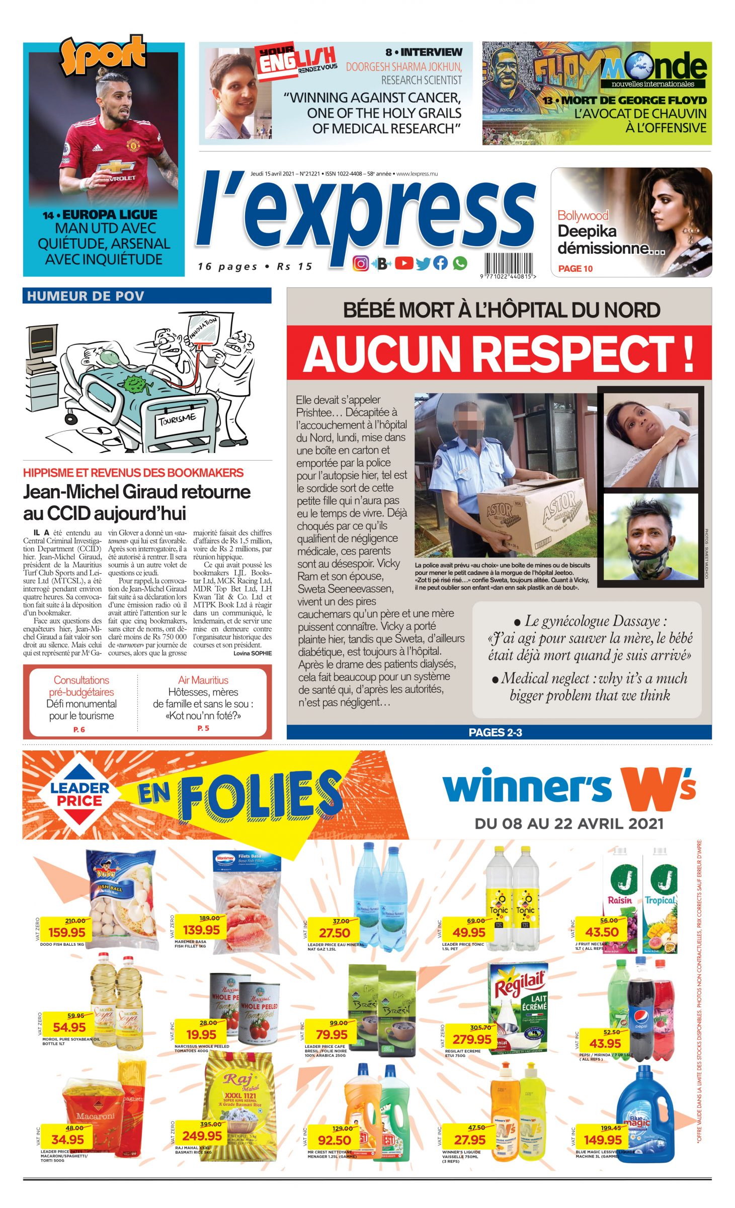 En une de l'express: Bébé mort à l’hôpital du nord aucun respect ! ; Autre titre: Jean-Michel Giraud retourne au CCID aujourd’hui