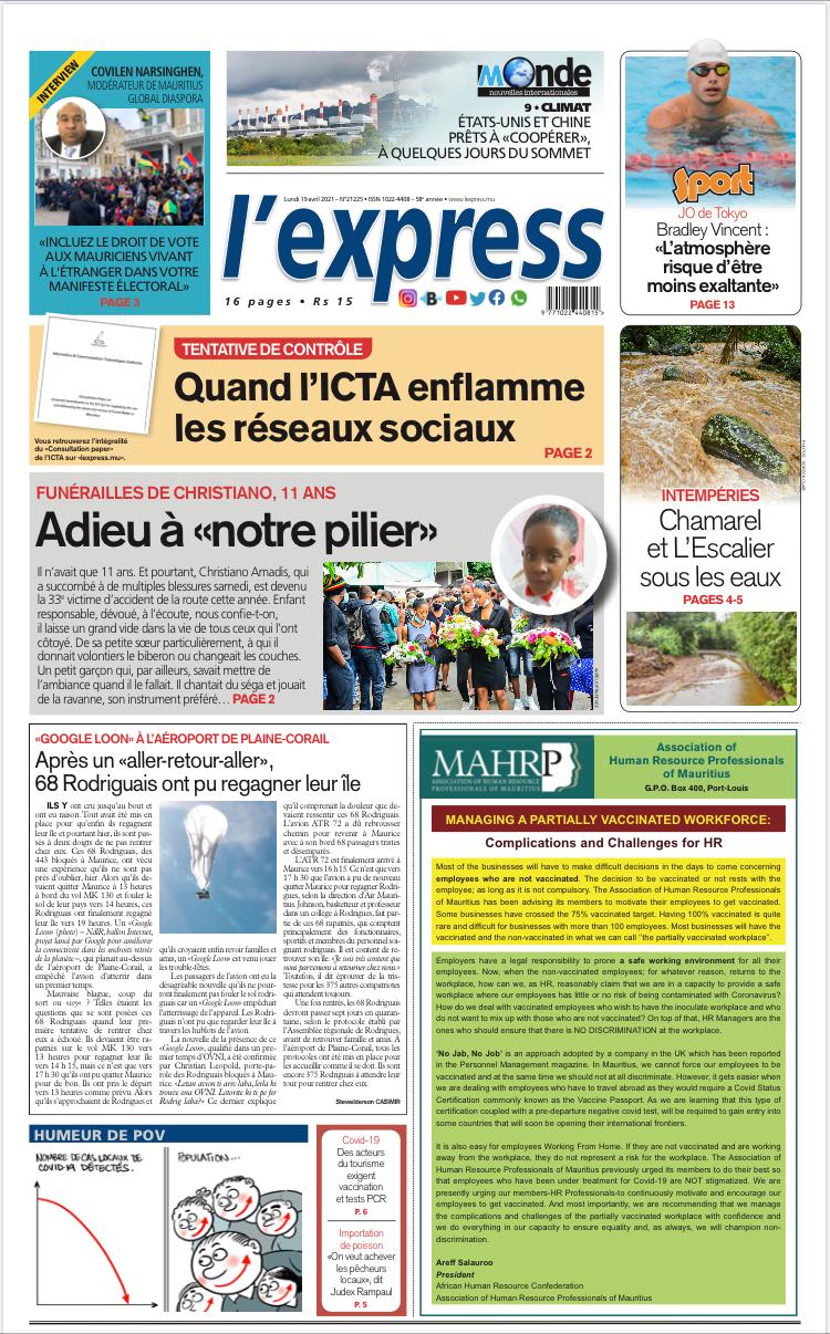 Les grands titres de l'express de ce lundi 19 avril 2021