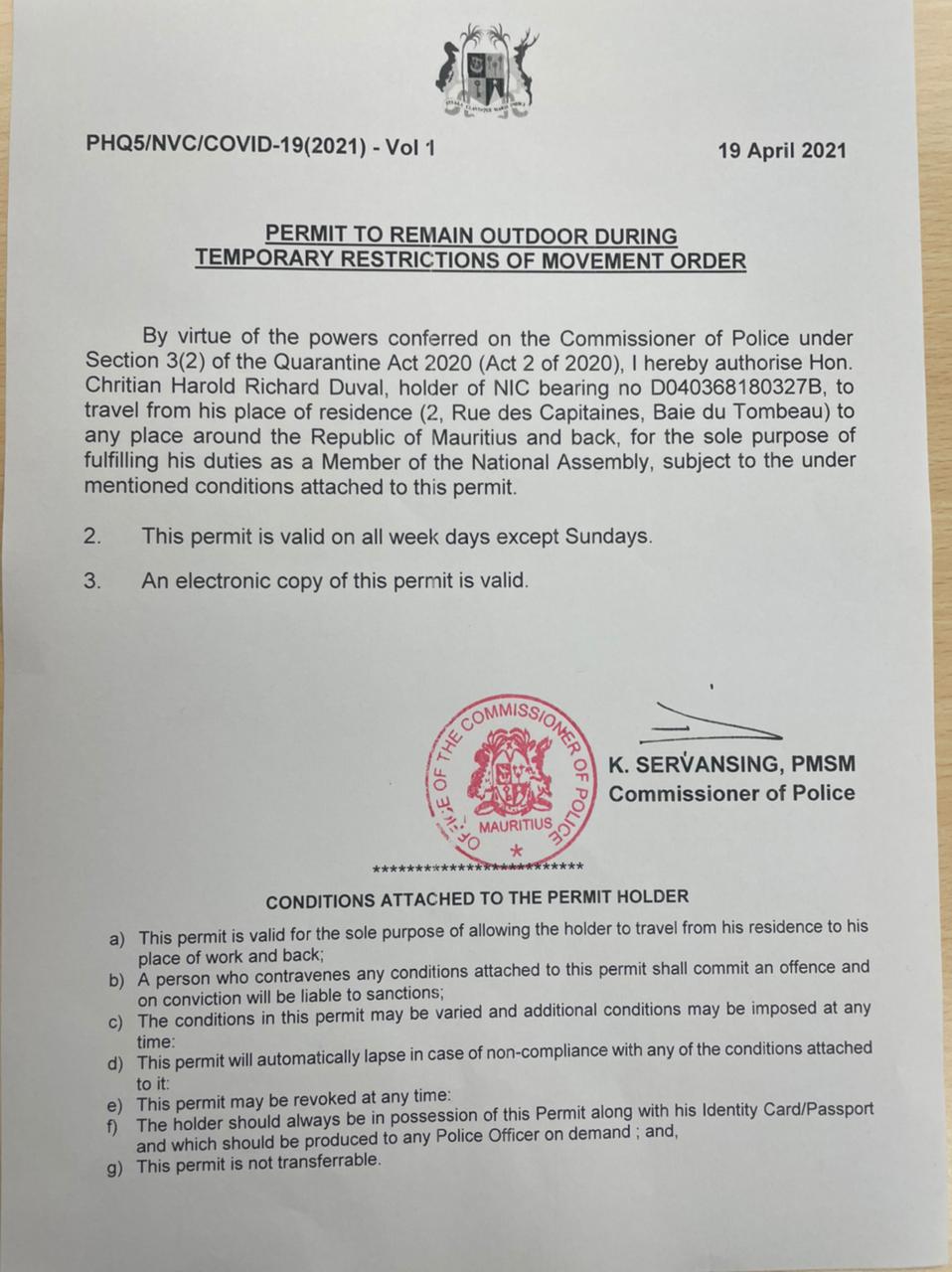 L’affaire a été appelée devant le Chef Juge ce lundi 19 avril. Richard Duval a reçu un document spécial signé par Khemraj Servansing, qui l’autorise à circuler à travers l’île du lundi au samedi pour accomplir des devoirs de députés.