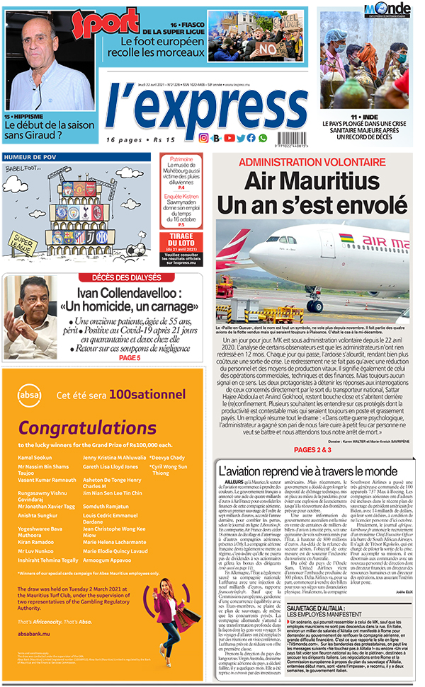 En une de l'express: Administration volontaire - Air Mauritius: un an s’est envolé ; Autre titre: Décès des dialysés - Ivan Collendavelloo: «Un homicide, un carnage».