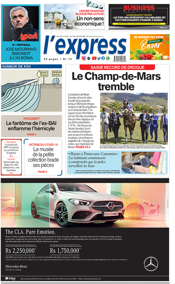En une de l'express: Saisie record de drogue: le Champ-de-Mars tremble ; Autre titre, Parlement: le fantôme de l’ex-BAI enflamme l’Hémicycle.