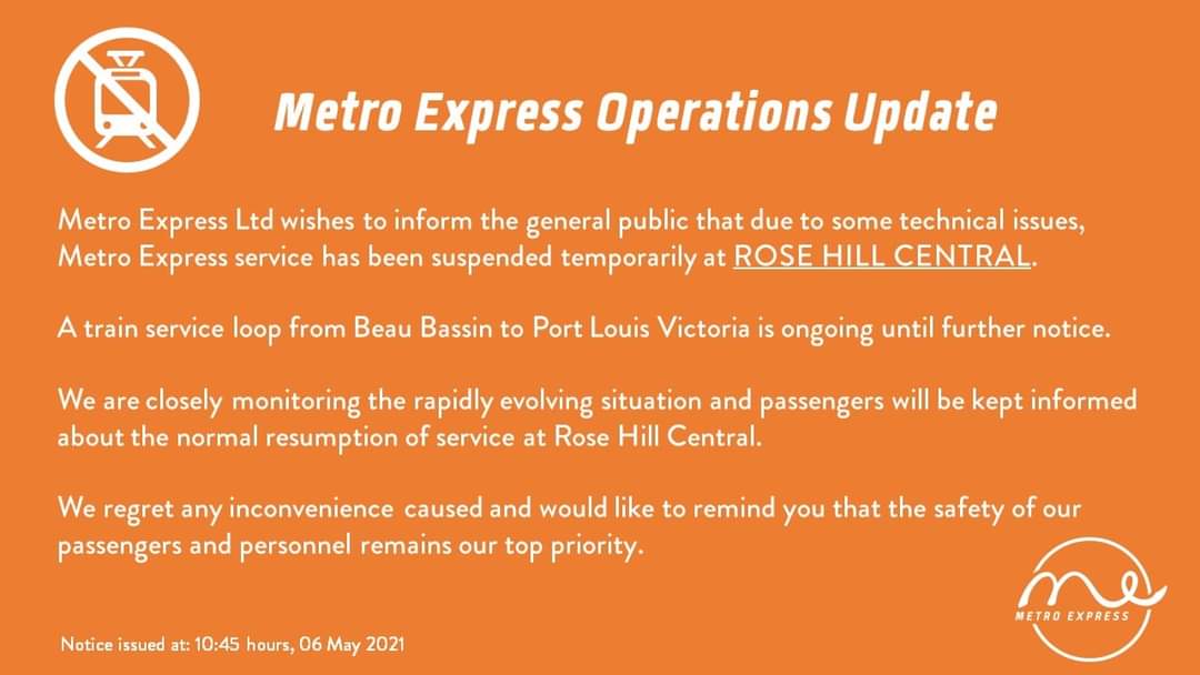 Dans un communiqué émis il y a quelques minutes, la compagnie Metro Express avise ses passagers que le service du Metro Express est temporairement suspendu à la station de Rose-Hill et ce, pour un temps indéfini. Des «problèmes techniques» y sont évoqués sans rentrer dans les détails. Par contre, le service est opérationnel de Beau-Bassin à Port-Louis et vice-versa. La situation est surveillée de près par la compagnie qui s’excuse pour l’inconvénient causé. Les passagers seront informés dès que le service reprendra son cours normal.