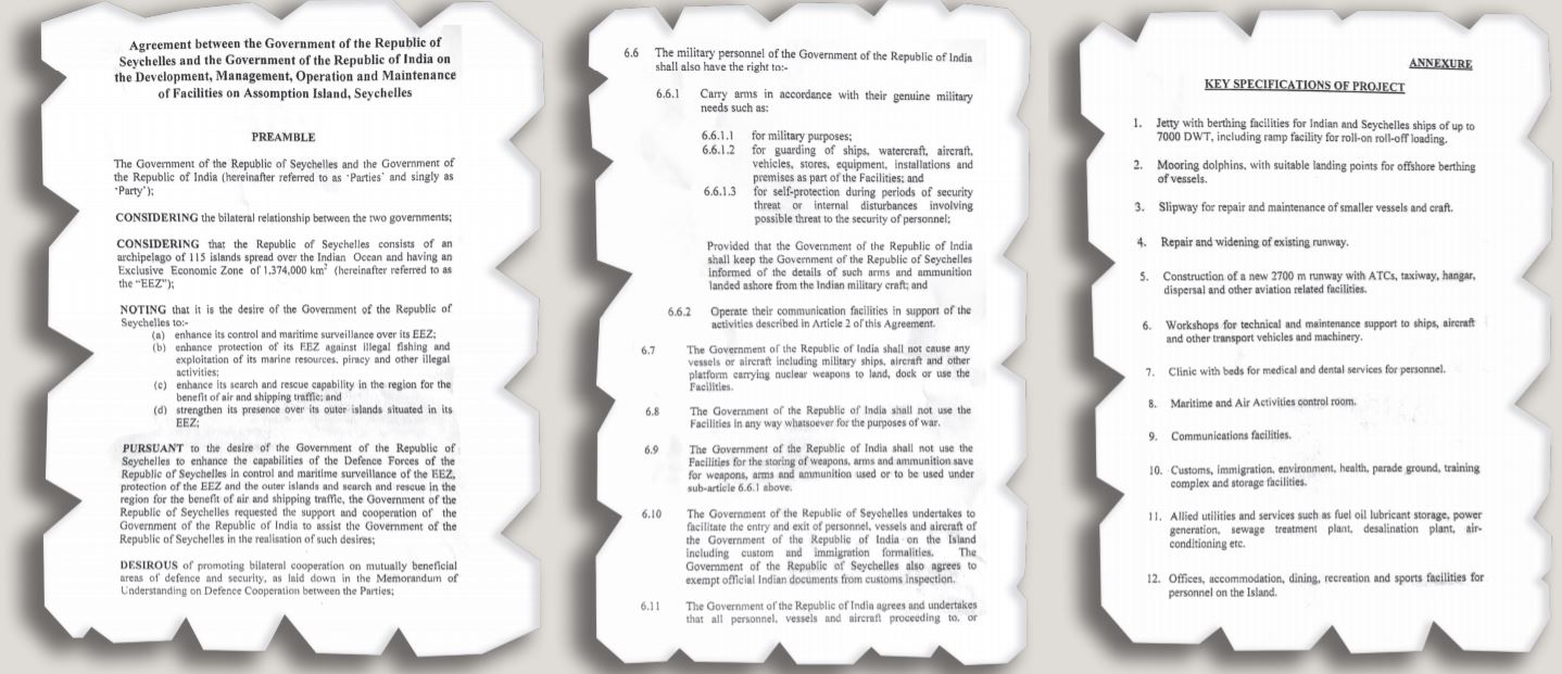 - Le gouvernement seychellois facilitera l’entrée et la sortie des militaires indiens ainsi que leurs navires et avions sur l’île. Les documents officiels indiens seront aussi exemptés de vérifications douanières.
