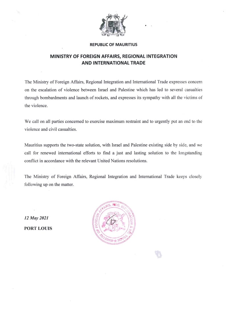 Alors que la situation est toujours explosive à Jérusalem-Est, théâtre de plusieurs jours d’affrontements, le ministère des Affaires étrangères mauricien a émis un communiqué pour faire connaître sa position à ce propos, en ce mercredi 12 mai. «Mauritius supports the two-state solution, with Israel and Palestine existing side by side (… )» peut-on ainsi lire dans le document, à lire dans son intégralité ci-dessous :