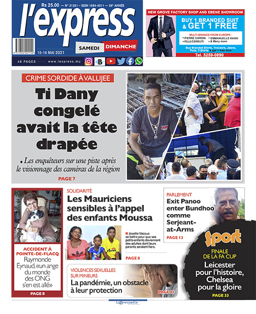 En une de l'express: Crime sordide à Vallijee: Ti Dany congelé avait la tête drapée ; Autre titre: Solidarité: Les Mauriciens sensibles à l’appel des enfants Moussa.