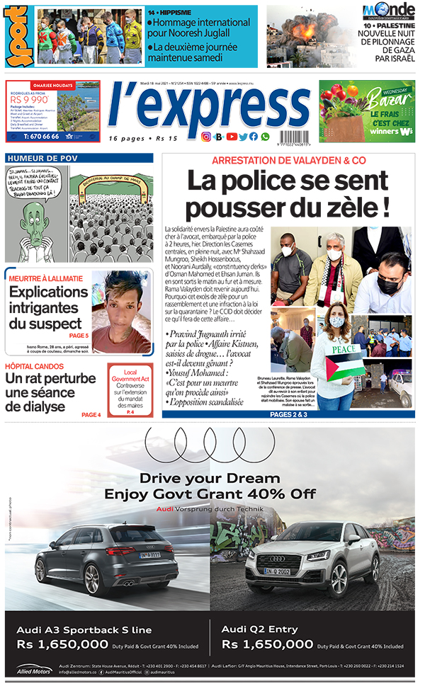 La solidarité envers la Palestine aura coûté cher à l'avocat, embarqué par la police à 2 heures, hier. Direction les Casernes centrales, en pleine nuit, avec Me Shahzaad Mungroo, Sheikh Hossenbocus, et Noorani Aurdally, «constintuency clerks» d’Osman Mahomed et Ehsan Juman. Ils en sont sortis le matin au fur et à mesure. Rama Valayden doit revenir aujourd’hui. Pourquoi cet excès de zèle pour un rassemblement et une infraction à la loi sur la quarantaine ? Le CCID doit décider ce qu’il fera de cette affaire…