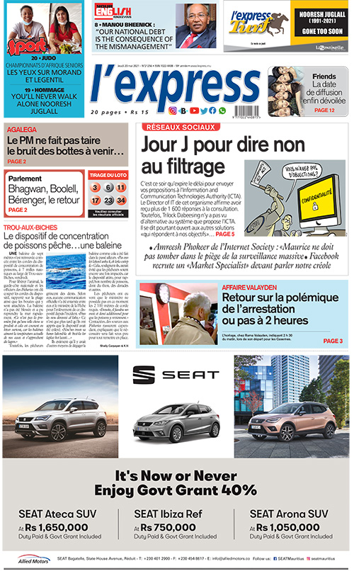 En une de l'express: Réseaux sociaux: Jour J pour dire non au filtrage ; Autre titre: Affaire Valayden: Retour sur la polémique de l’arrestation ou pas à 2 heures.