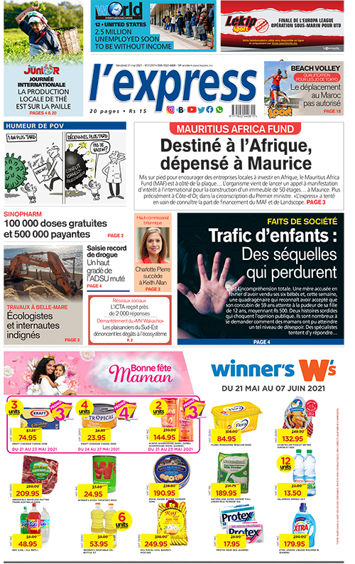 En une de l'express: Mauritius Africa Fund : Destiné à l’Afrique, dépensé à Maurice ; Autre titre: Faits de société - Trafic d’enfants: Des séquelles qui perdurent.