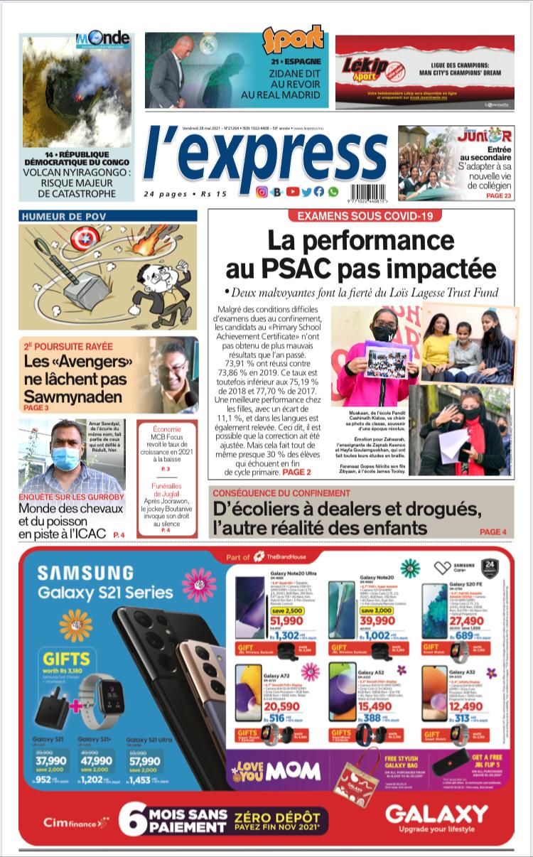 En une de l'express: Examens sous Covid-19: La performance au PSAC pas impactée; Autre titre: Conséquence du confinement: D’écoliers à dealers et drogués, l’autre réalité des enfants.