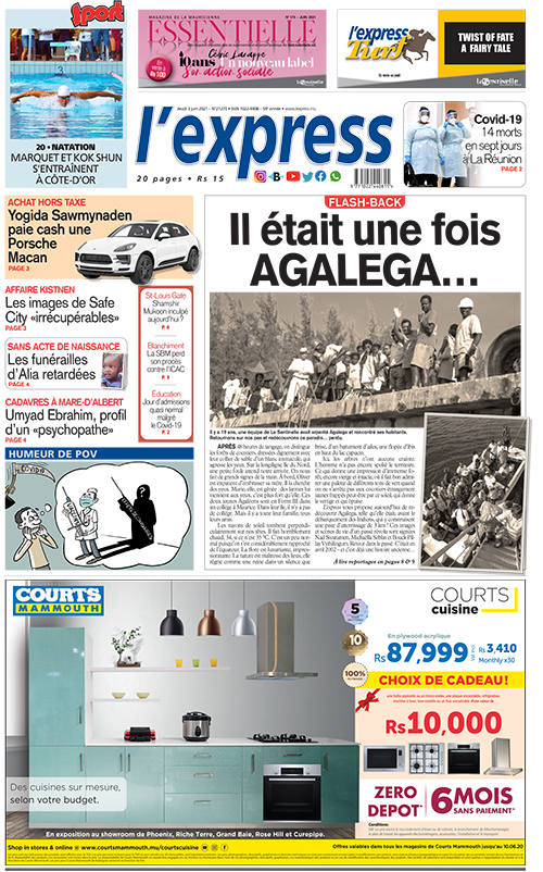 En une de l'express: Flash-back : Il était une fois Agalega… ; Autre titre: Affaire Kistnen : Les images de Safe City «irrécupérables».
