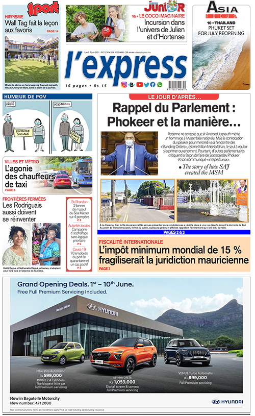 En une de l'express: Le jour d’après… - Rappel du Parlement : Phokeer et la manière… ; Autre titre: Fiscalité internationale : L’impôt minimum mondial de 15 % fragiliserait la juridiction mauricienne.