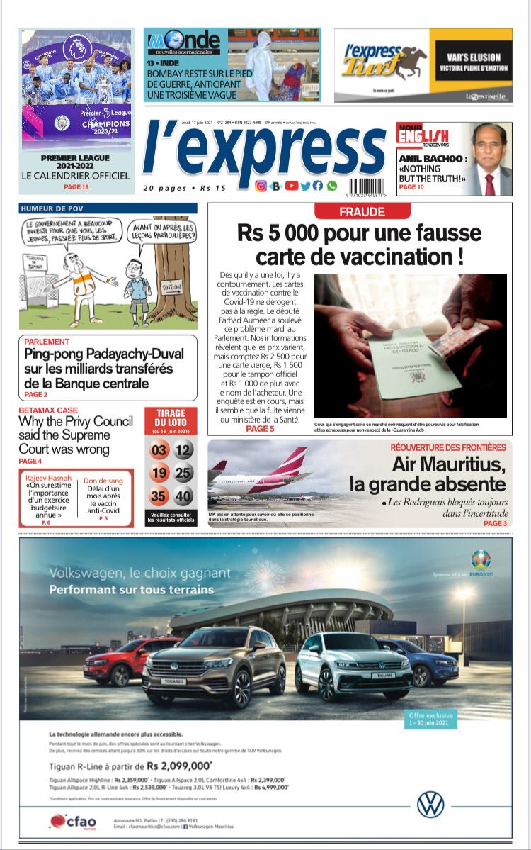 En une de l'express: Fraude: Rs 5 000 pour une fausse carte de vaccination !; Autre titre: Réouverture des frontières: Air Mauritius, la grande absente.