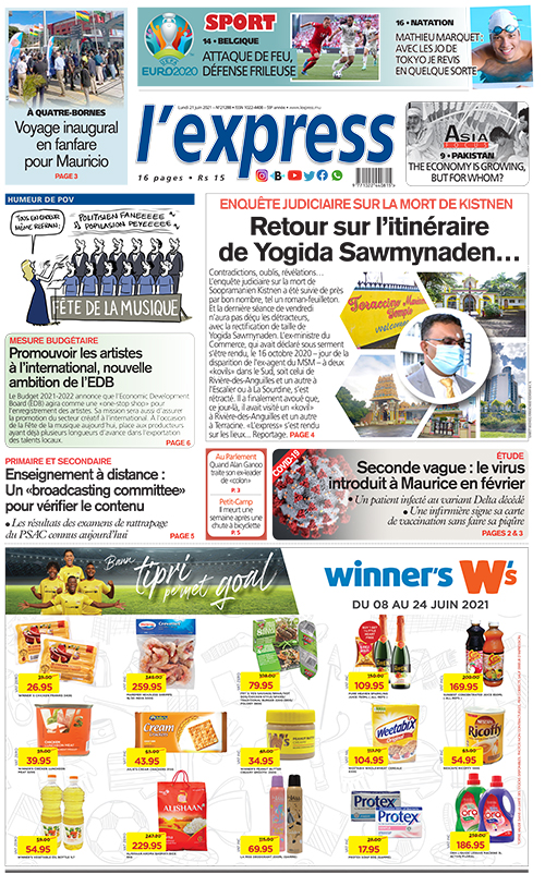 En une de l'express: Enquête judiciaire sur la mort de Kistnen : Retour sur l’itinéraire de Yogida Sawmynaden… ; Autre titre: Seconde vague : le virus introduit à Maurice en février.
