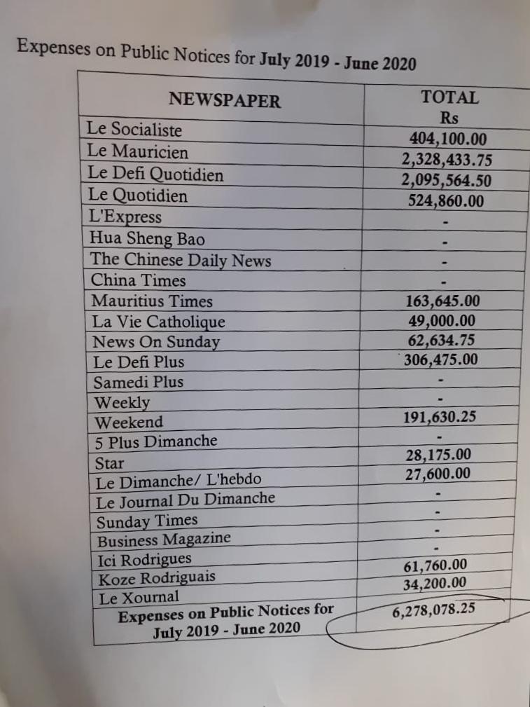 La question avait été posée par le député du MMM, Rajesh Bhagwan, qui voulait savoir comment le Governement Information Service a dépensé l’argent public alloué dans le budget pour les annonces publicitaires. Rien que pour l’année financière 2020-2021, ce département a eu Rs 10 millions pour les annonces et publicités.