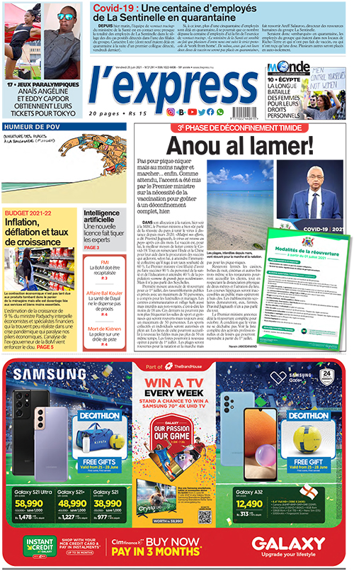 En une de l'express: 3e phase de déconfinement timide : Anou al lamer! ; Autre titre: Budget 2021-22 : Inflation, déflation et taux de croissance.