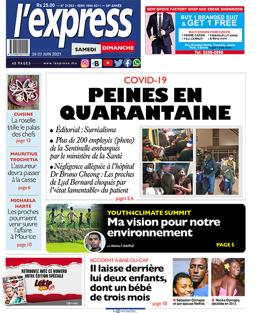 En une de l'express: Covid-19 : Peines en quarantaine ; Autre titre: Accident à Baie-du-Cap : Il laisse derrière lui deux enfants, dont un bébé de trois mois.