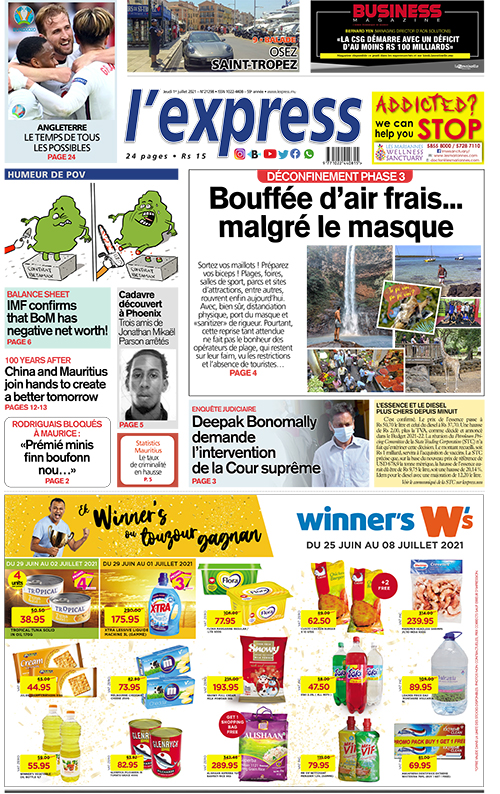 En une de l'express: Déconfinement phase 3 : Bouffée d’air frais... malgré le masque ; Autre titre: Enquête judiciaire : Deepak Bonomally demande l’intervention de la Cour suprême.