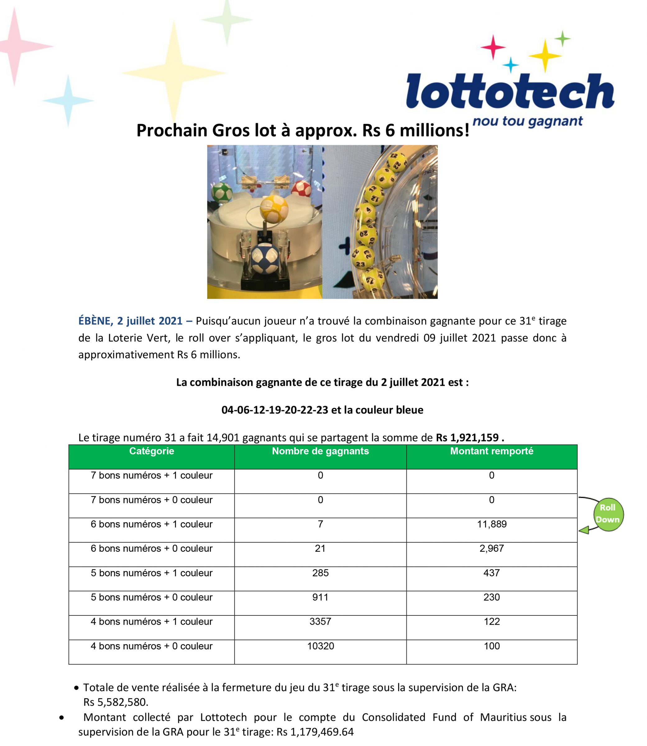 Du coup le jackpot pour le prochain tirage passe à Rs 6 millions.