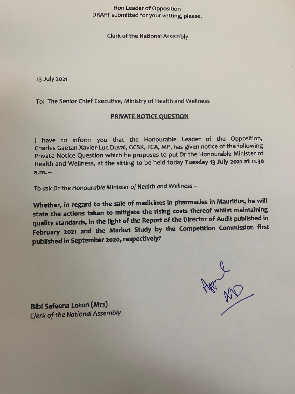 La PNQ sera en fait adressée au ministre de la Santé, Kailesh Jagutpal et elle concernera les prix des médicaments, notamment. N’y a-t-il pas des dossiers plus urgents à traiter, se demandent ainsi les sceptiques ? Xavier Duval ‘ménage’-t-il le gouvernement ? Est-ce qu’il y aurait quelque rapprochement dans l’air ? Le temps nous le dira…