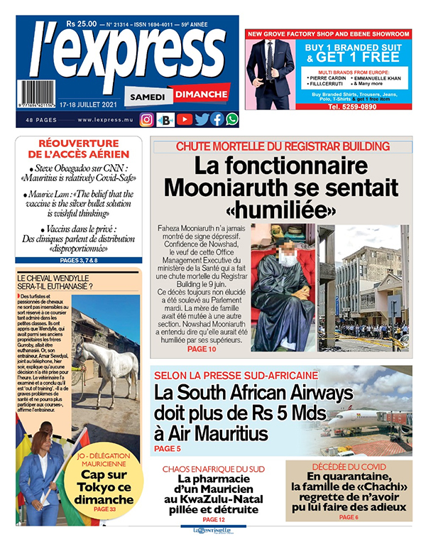 Votre journal deux en un de 48 pages en vente tout le week-end est en kiosque. Au coeur de l'actualité: Chute mortelle du Registrar Building: la fonctionnaire Mooniarut se sentait «humiliée» ; Autre titre: Vaccins dans le privé: des cliniques parlent de distribution «disproportionnée».