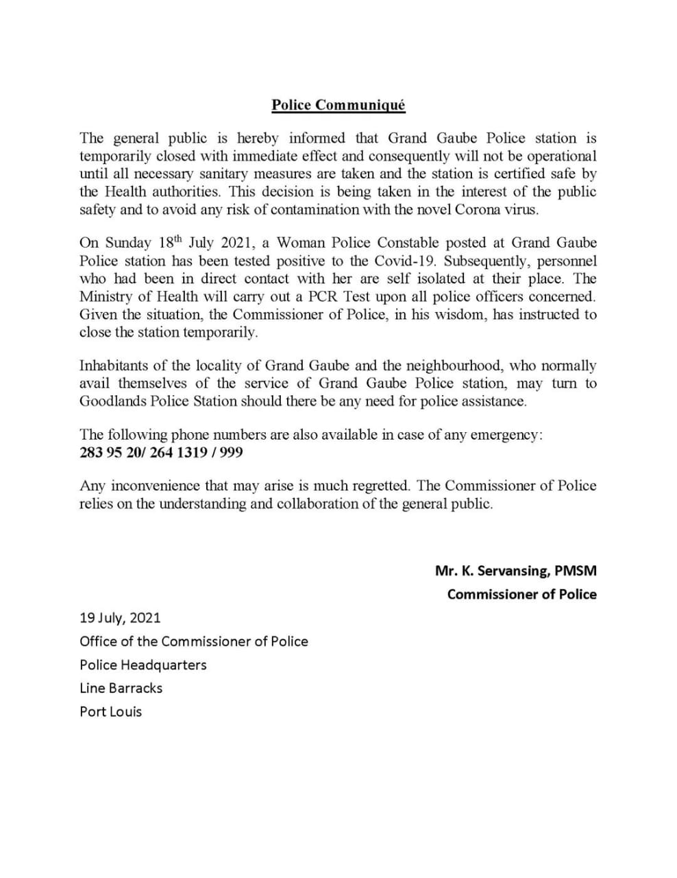 Le communiqué a été émis en ce lundi 19 juillet. Le poste de police de Grand-Gaube ferme ses portes pour des raisons sanitaires, après qu’une policière affectée à ce poste a été testée positive au Covid-19, dimanche, stipule le document. Ses collègues ont été priés de s’auto-isoler, en attendant que des tests PCR soient faits. Le poste de police reste fermé jusqu’à nouvel ordre.
