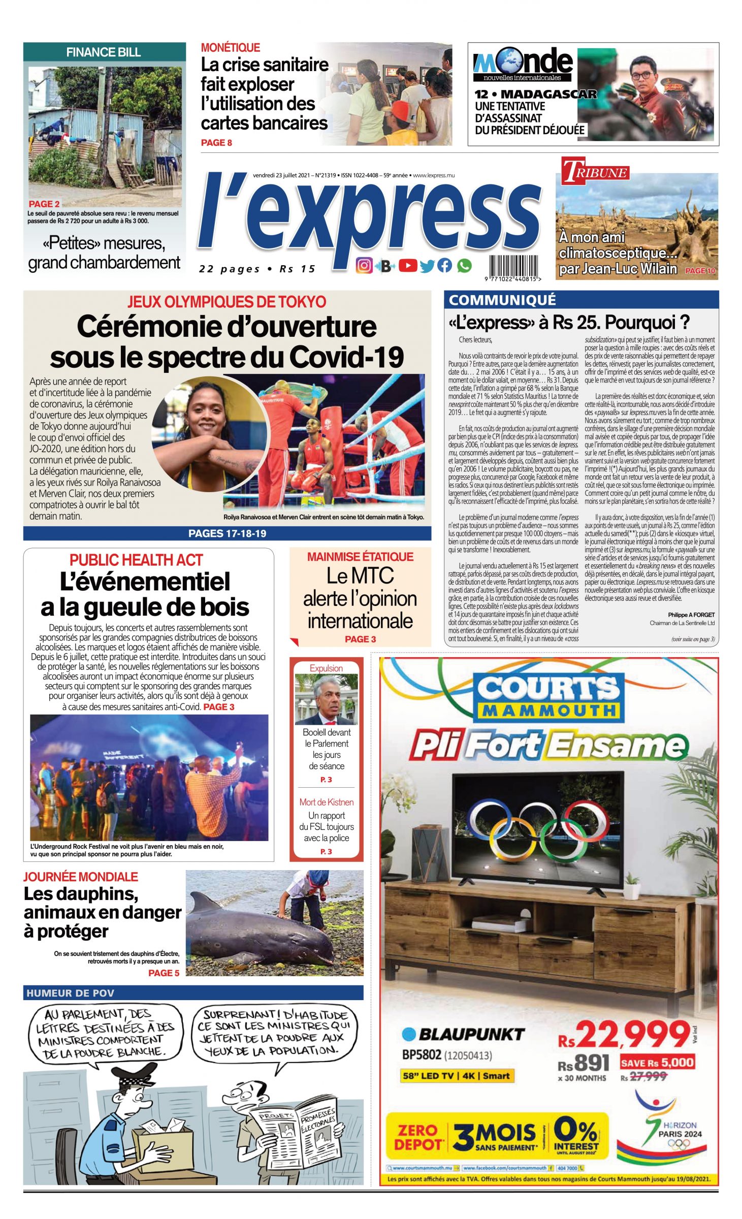 En une de l'express: Cérémonie d’ouverture sous le spectre du Covid-19,Autre titre;«L’express» à Rs 25. Pourquoi ?