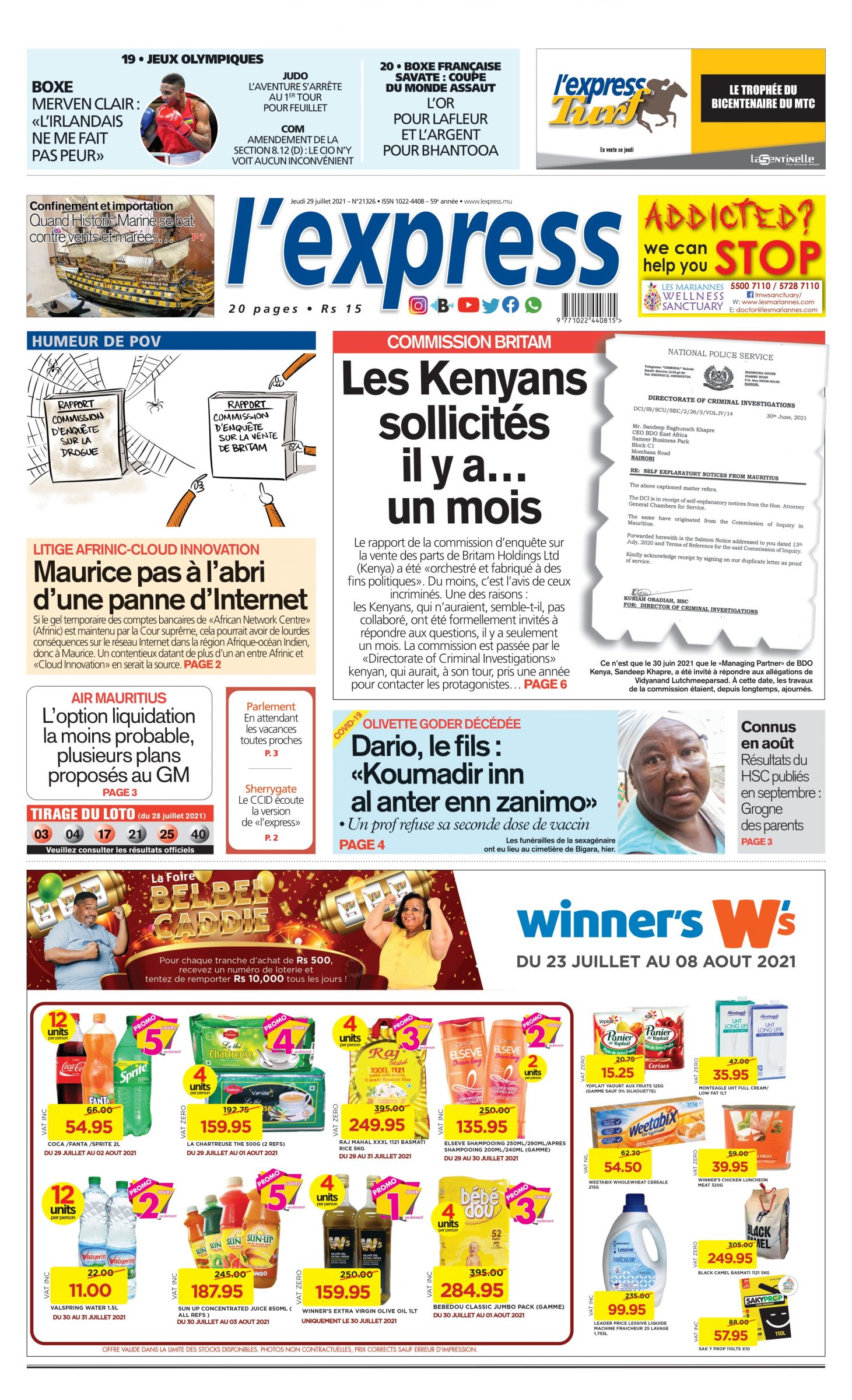 En Une de l'express: Les Kenyans sollicités il y a… un mois;Autre titre;Maurice pas à l’abri d’une panne d’Internet.