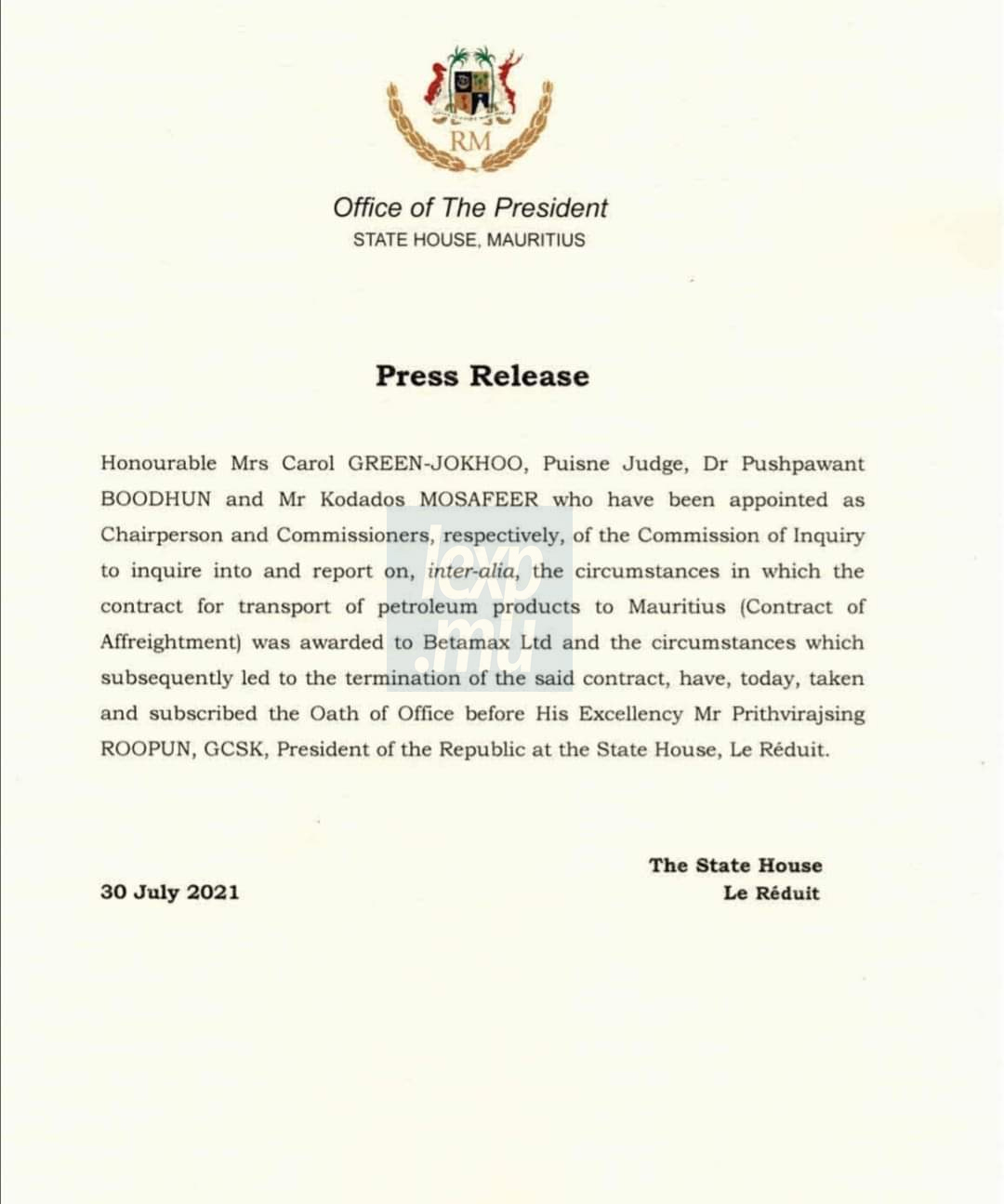 Ils auront pour tâche de déterminer les conditions de l’octroi du contrat de fourniture de produits pétroliers à Betamax et de sa résiliation. La Puisne Judge, Carol Green-Jokhoo et ses deux assesseurs, le Dr Pushpawant Boodhun et Kodados Mosafeer, ont prêté serment ce vendredi 30 juillet, à la State House.