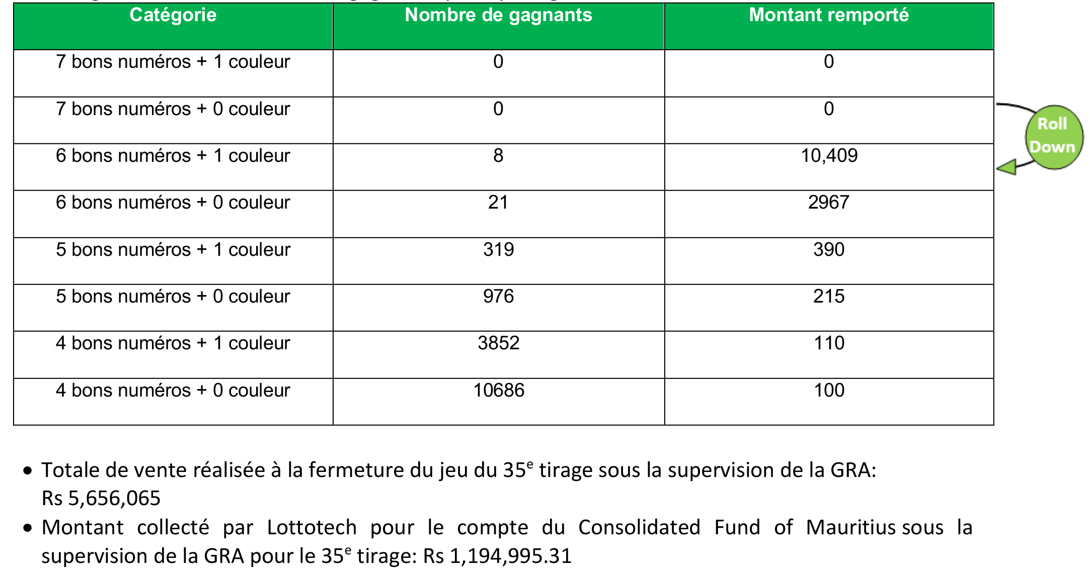 Ce tirage numéro 35 a fait 15 862 gagnants qui se partagent la somme de Rs 1 972 149.