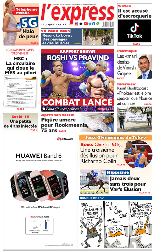En une de l'express: Rapport Britam: Roshi vs Pravind ; Autre titre - Polémique: les «mari deals» de Vinash Gopee.