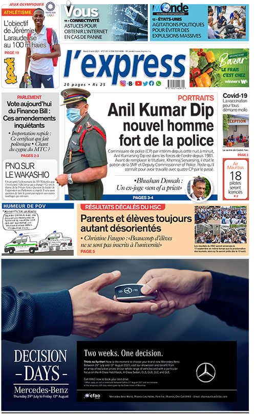En une de l'express: Portraits : Anil Kumar Dip nouvel homme fort de la police ; Autre titre: Parlement - Vote aujourd’hui du Finance Bill : Ces amendements inquiétants.