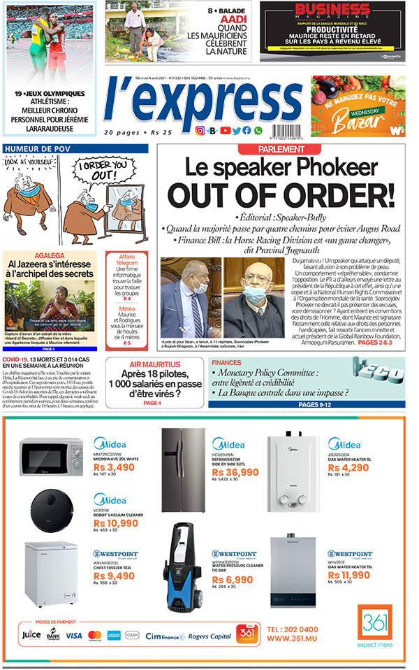 En une de l'express : Le speaker Phokeer: out of order! Autre titre; Air Mauritius: après 18 pilotes, 1 000 salariés en passe d’être virés ?