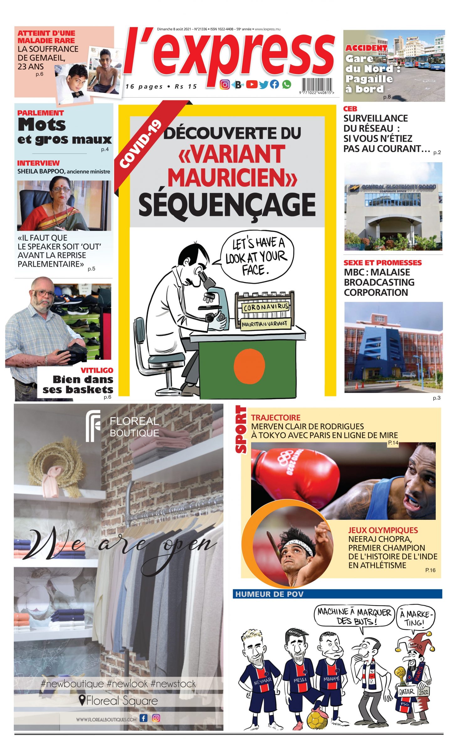 En Une de l'express:Découverte du «variant mauricien»Séquençage;Autre titre; Parlement:Mots et gros maux
