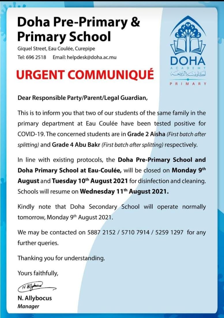 Suivant des cas d’infection au Covid-19, le collège Père Laval sera fermé le lundi 9 août et les établissements pré-primaire et primaire de Doha n’accueilleront pas des enfants les lundi 9 et mardi 10 août.