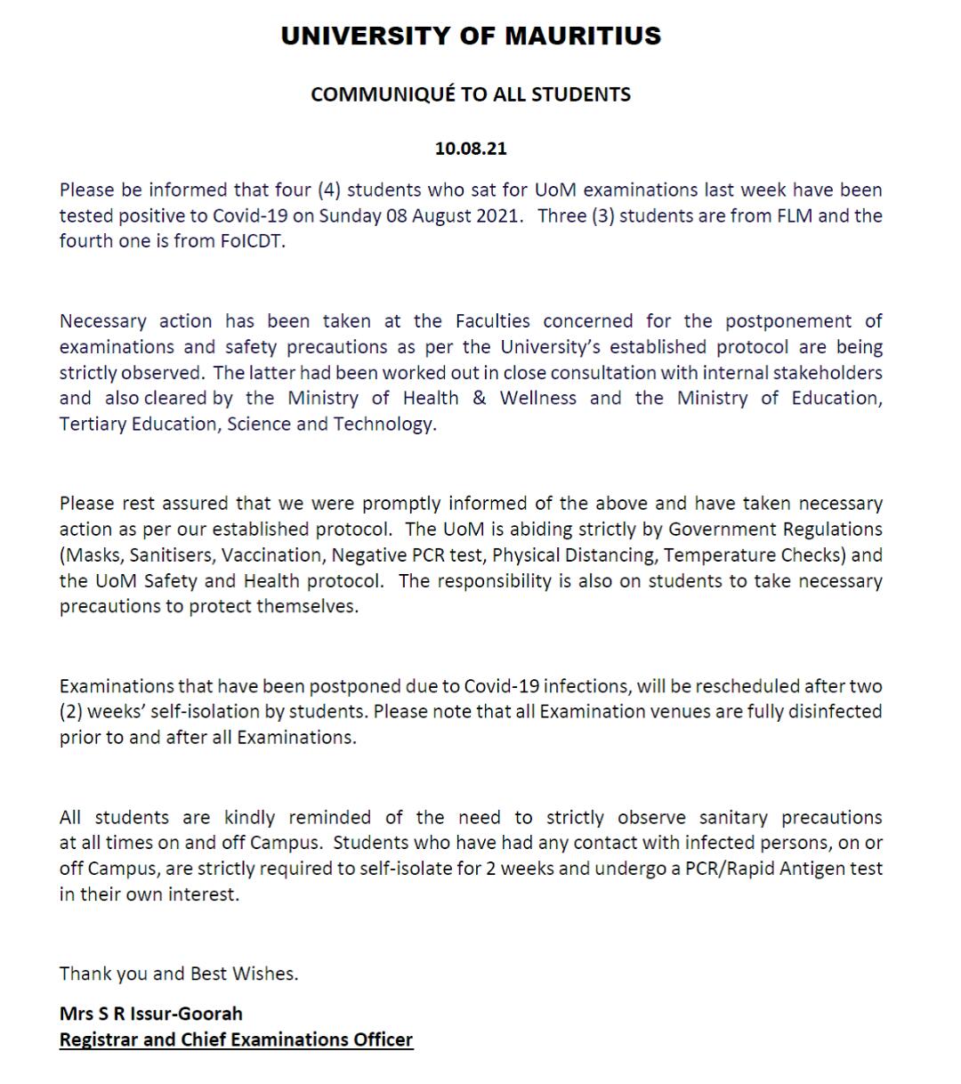 Suite à la détection de quatre cas à l’Université de Maurice, la direction a pris la décision de repousser les examens des facultés des patients. Un communiqué a été émis à l’attention des élèves ce mardi 10 août.