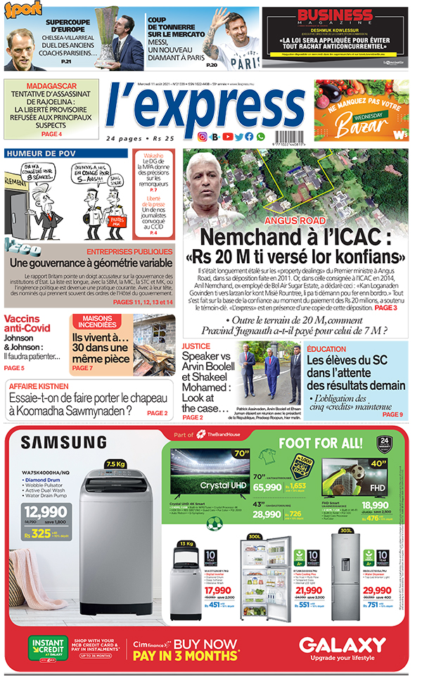 En une de l'express: Nemchand à l’ICAC: «Rs 20 M ti versé lor konfians» ; Autre titre: Speaker vs Arvin Boolell et Shakeel Mohamed: look at the case…
