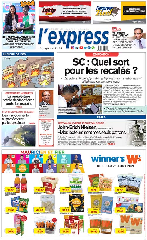 En une de l'express: Éducation - SC : Quel sort pour les recalés ? ; Autre titre: Festival du livre de Trou-d’Eau-Douce - John-Erich Nielsen, auteur à succès : «Mes lecteurs sont mes seuls patrons».