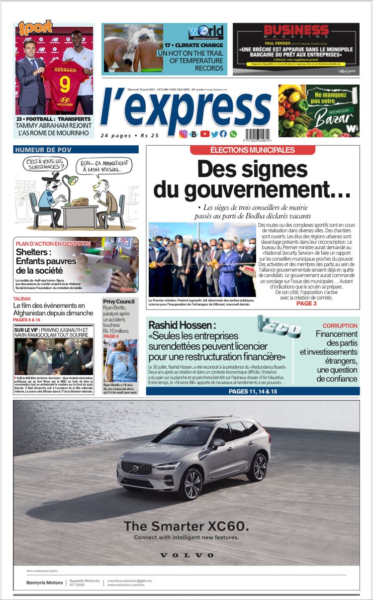 En une de l'express: Élections Municipales: Des signes du gouvernement…; Autre titre: Rashid Hossen: «Seules les entreprises surendettées peuvent licencier pour une restructuration financière».