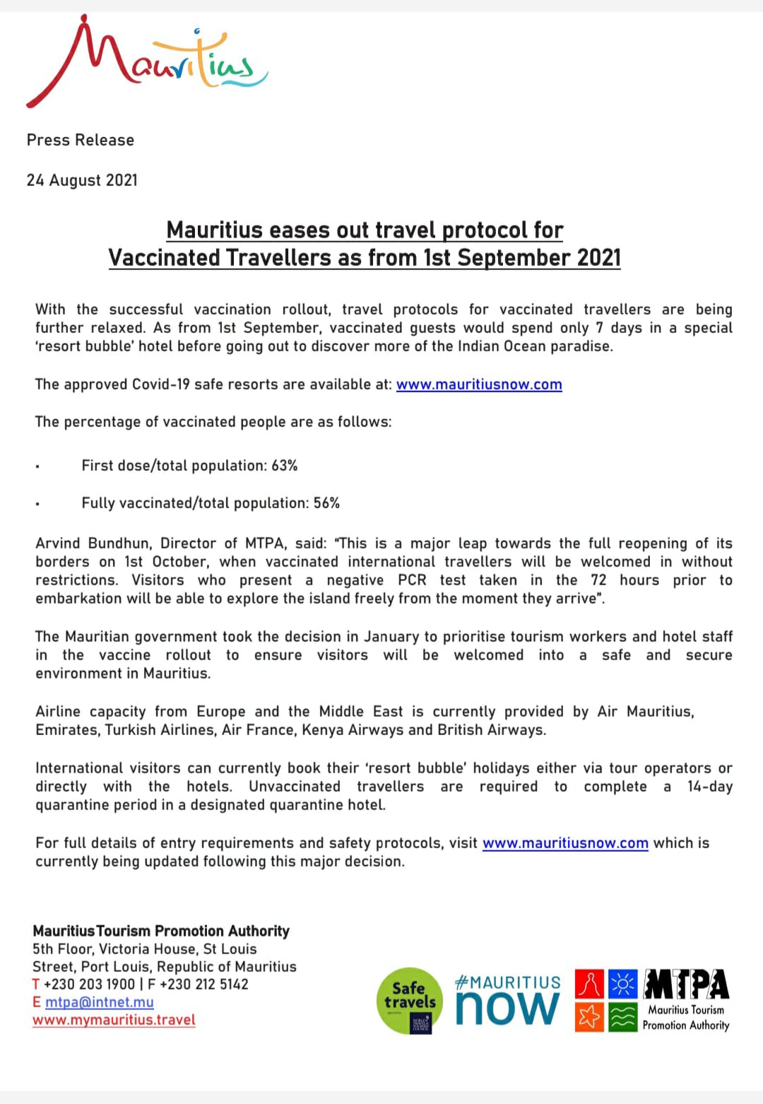 La quarantaine passe de 14 à sept jours pour les visiteurs vaccinés à compter du 1er septembre. C'est ce qu'indique la Mauritius Tourism Promotion Authority (MTPA) dans un communiqué émis ce mardi 24 août.