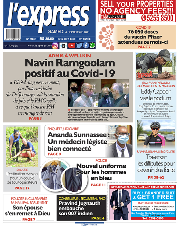 En une de l'express de ce samedi 4 septembre 2021 : Admis à Wellkin: Navin Ramgoolam positif au Covid-19 ; Autre titre: Covid-19: 76 050 doses du vaccin Pfizer attendues ce mois-ci.