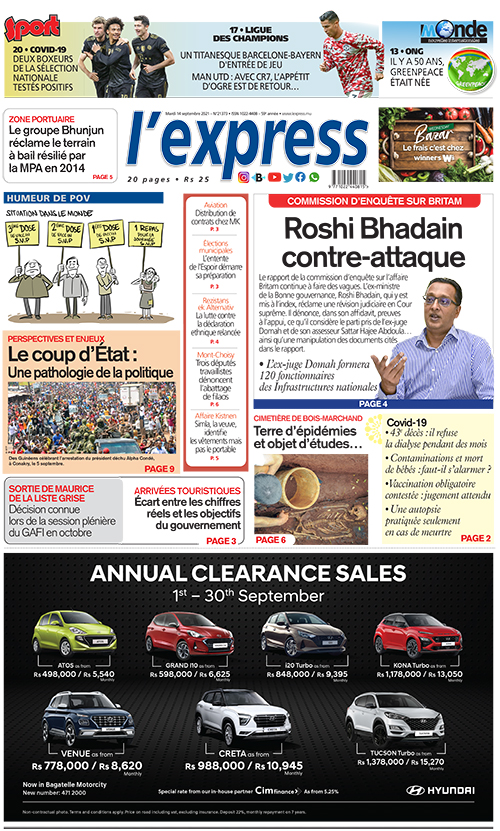 En une de l'express de ce mardi: Commission d’enquête sur Britam : Roshi Bhadain contre-attaque ; Autre titre: Cimetière de Bois-Marchand : Terre d’épidémies et objet d’études…