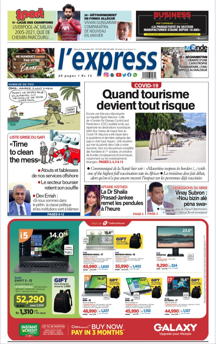 En une de l'express: Covid-19 : Quand tourisme devient tout risque; Autre titre: Affaire Kistnen: La Dr Shaila Prasad-Jankee remet les pendules à l’heure.