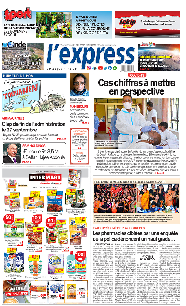 En une de l'express: Covid-19: ces chiffres à mettre en perspective ; Autre titre: Air Mauritius: clap de fin de l’administration le 27 septembre