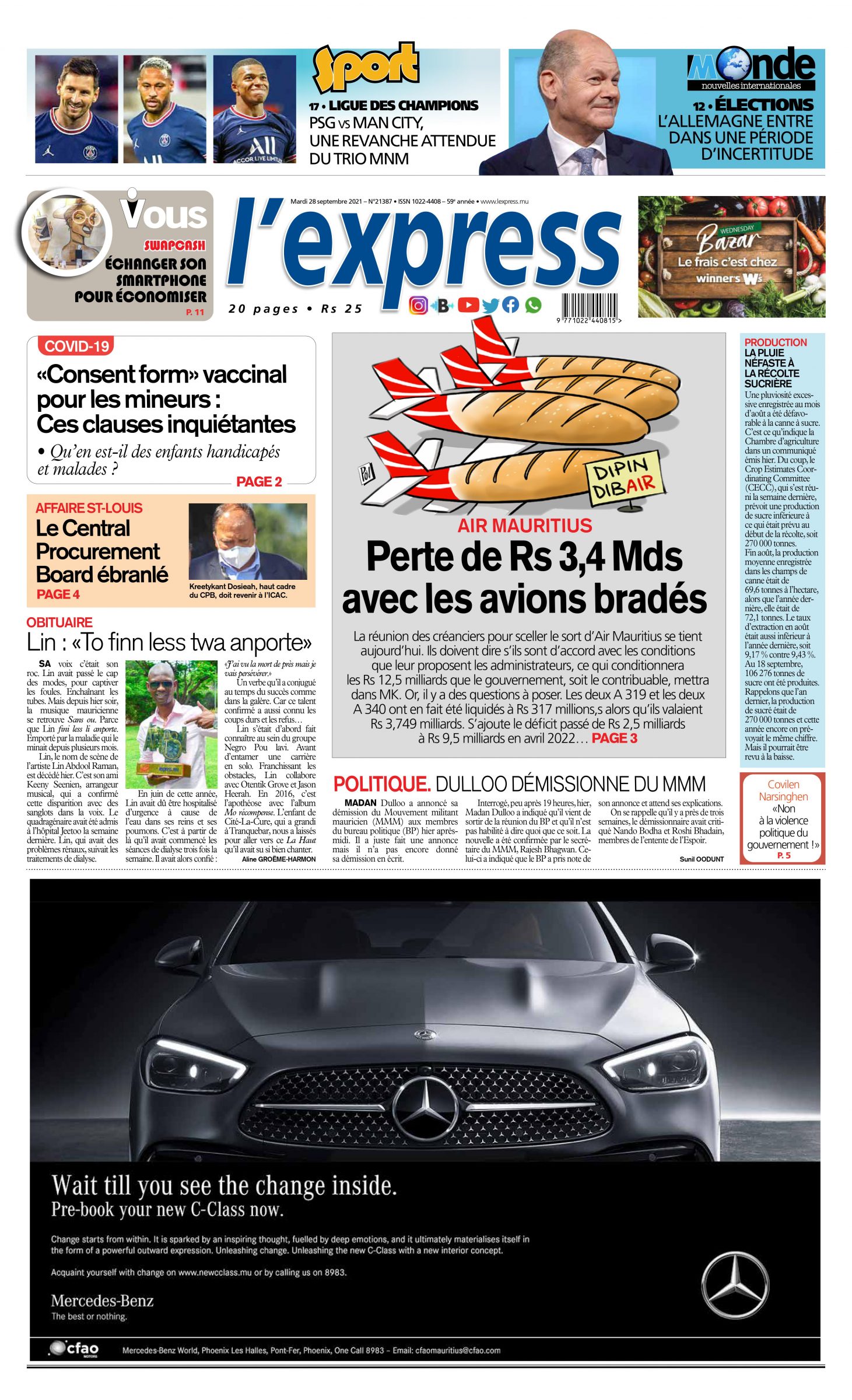 En une de l'express: Air Mauritius: Perte de Rs 3,4 Mds avec les avions bradés; Autre titre: Politique: Dulloo démissionne du MMM.