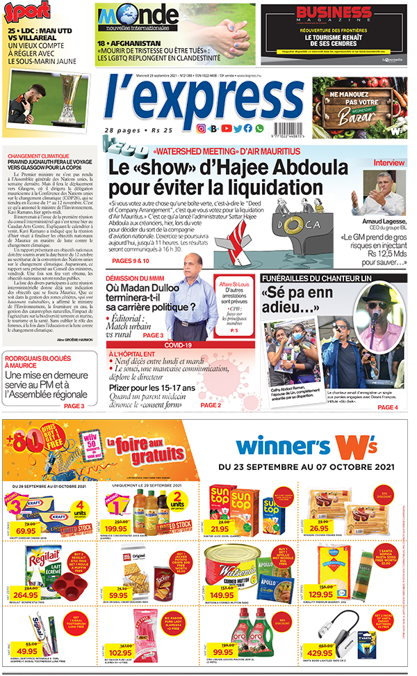 En une de l'express: Watershed meeting d’Air Mauritius: le «show» d’Hajee Abdoula pour éviter la liquidation ; Autre titre: Funérailles du chanteur Lin: «Sé pa enn adieu…»