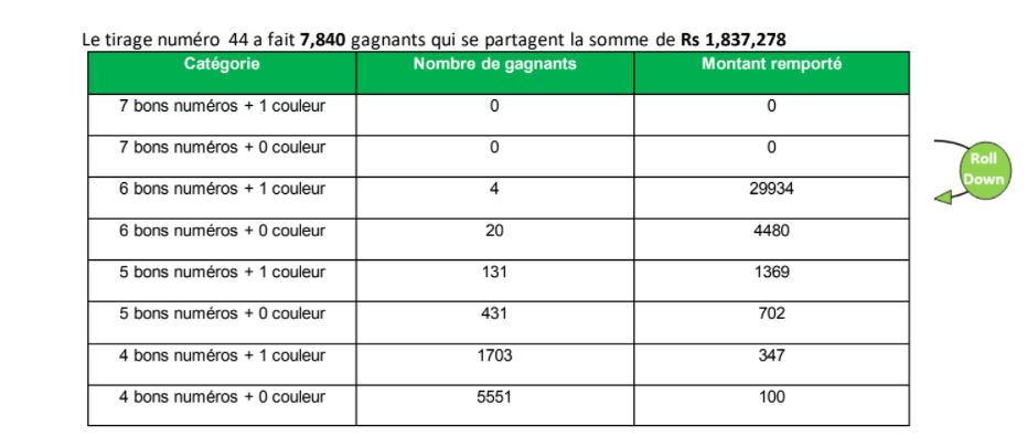Puisqu’aucun joueur n’a trouvé la combinaison gagnante pour ce 44 e tirage de la Loterie Vert, le roll over s’appliquant, le gros lot du vendredi 08 octobre 2021 passe donc à approximativement Rs 11,5 millions.