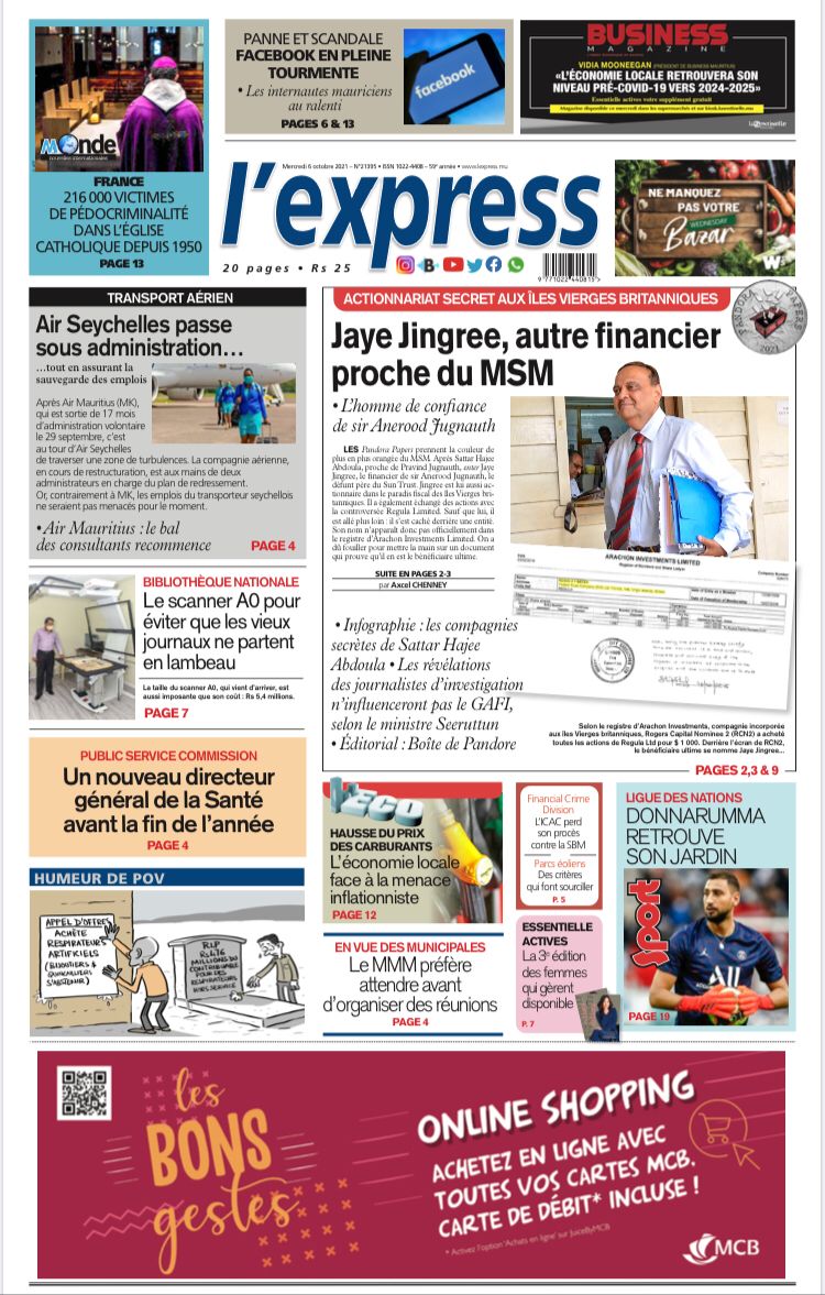 En une de l'express: Actionnariat secret aux îles Vierges britanniques: Jaye Jingree, autre financier proche du MSM; Autre titre: Transport aérien: Air Seychelles passe sous administration…