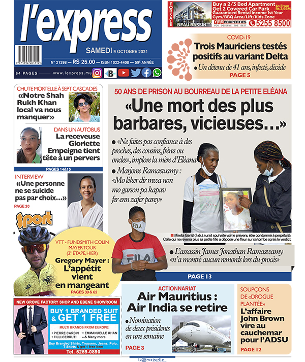 En une de l'express: 50 ans de prison au bourreau de la petite Eléana: «Une mort des plus barbares, vicieuses…» ; Autre titre: Chute mortelle à Sept Cascades: «Notre Shah Rukh Khan local va nous manquer»