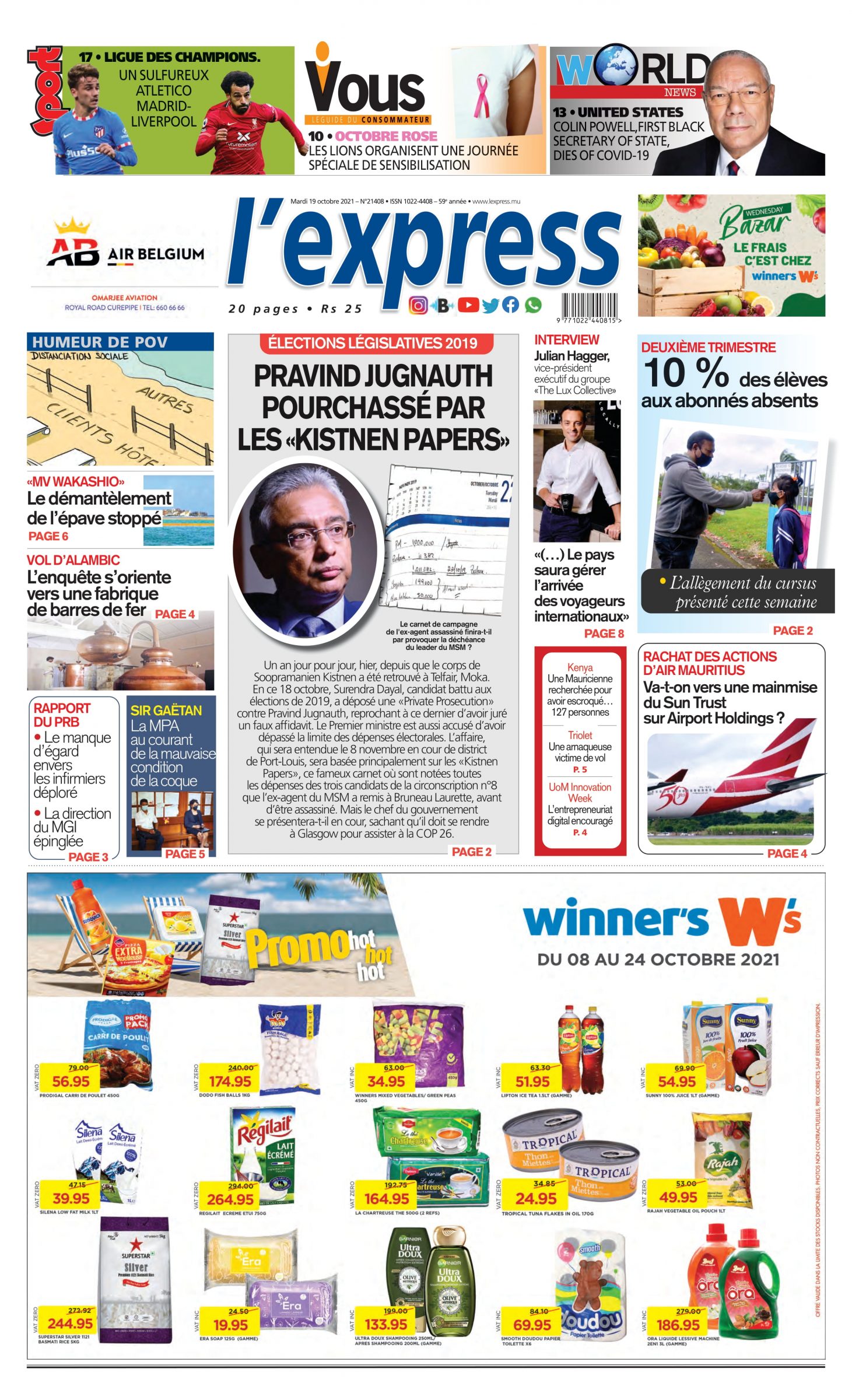 En Une de l'express: Pravind Jugnauth pourchassé par les «Kistnen papers»; Autre titre;Deuxième trimestre:10 % des élèves aux abonnés absents